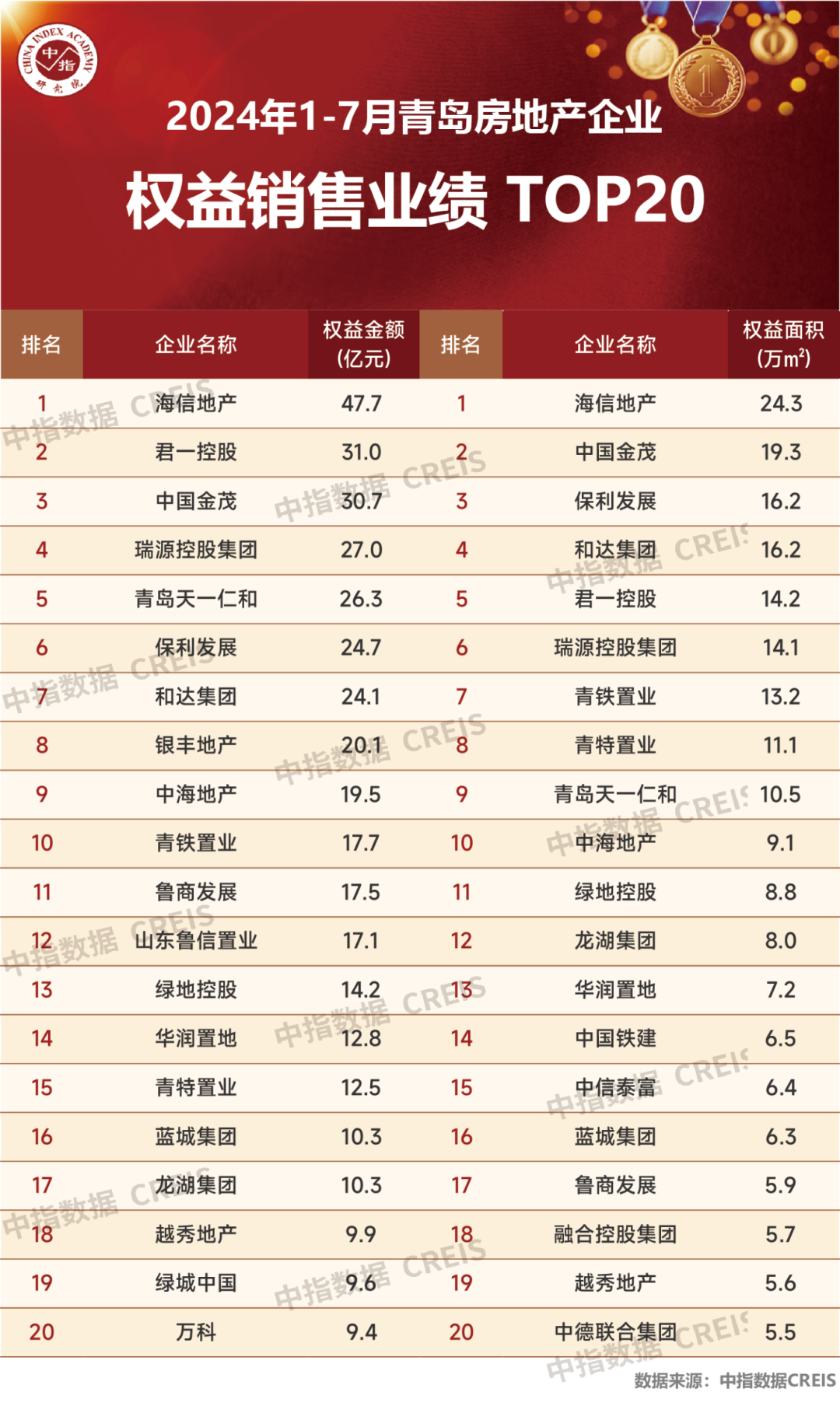 青岛市2024年1-7月房企权益销售业绩TOP20